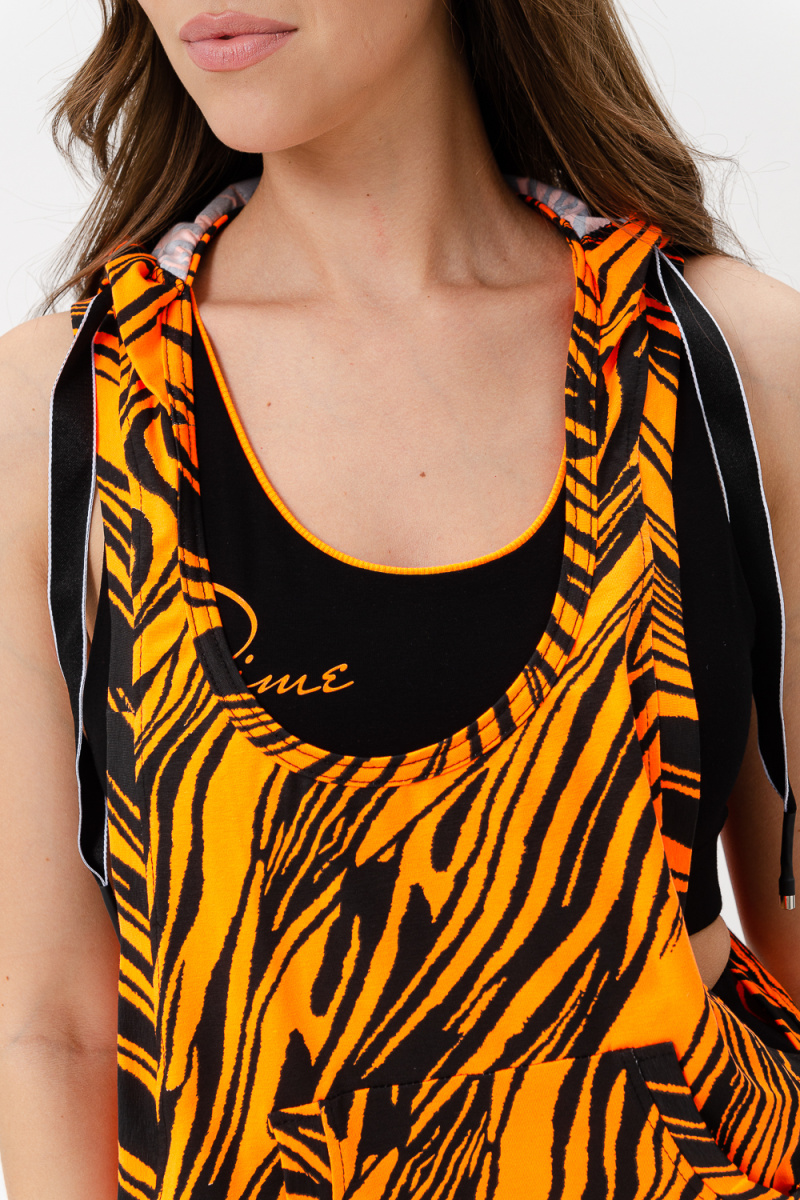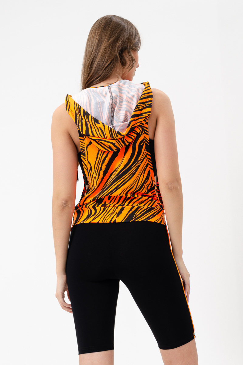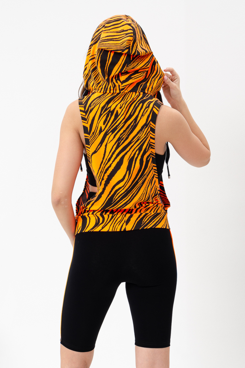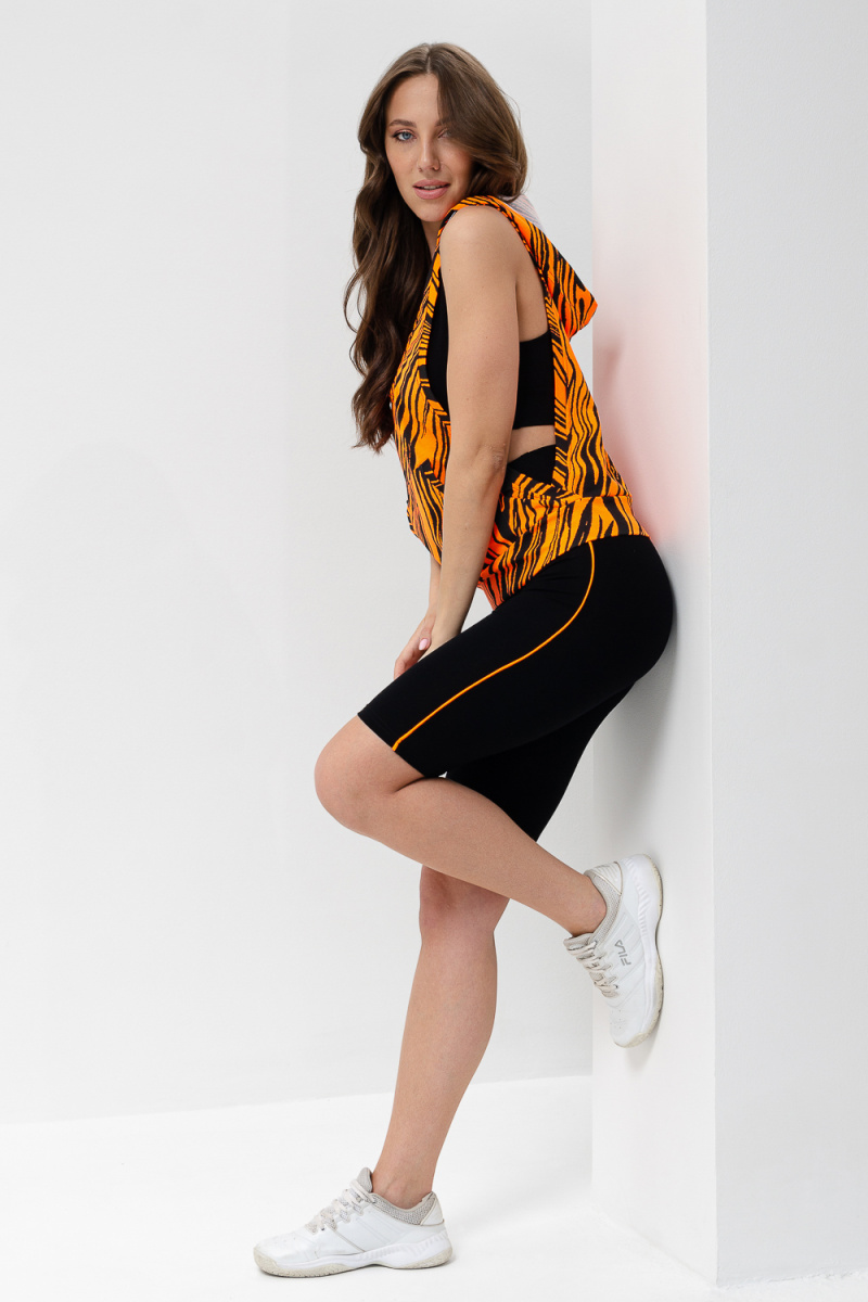 Костюм спортивный женский - тройка, состоит из яркого худи с капюшоном, велосипедок на широком эластичном поясе и укороченного топа со стильным принтом. Подходит для активного отдыха и занятий спортом. Очень удобен для езды на велосипеде.